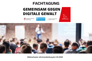 Am 11. März 2026 findet im LIBRA in Ludwigsfelde die Fachtagung „Gemeinsam gegen digitale Gewalt" statt (9:30 – 15:30 Uhr). Die Veranstaltung bildet den Abschluss der gleichnamigen Kampagne des LPR, MBJS und WEISSEN RINGS. Höhepunkt ist die Verleihung des Brandenburgischen Präventionspreises 2025/2026, der als Kreativwettbewerb „Gemeinsam KREATIV gegen digitale Gewalt" ausgeschrieben wurde. Darüber hinaus erwarten Sie spannende Vorträge und Austauschformate zu aktuellen Erscheinungsformen digitaler Gewalt und präventiven Handlungsmöglichkeiten. Die Fachtagung richtet sich an Medienpädagog*innen, Fachkräfte der Jugend- und Schulsozialarbeit, Lehrkräfte, Schulleitungen, Polizeibeschäftigte und alle weiteren Interessierten. Der Landespräventionsrat arbeitet mit Hochdruck an der Finalisierung des Tagungsprogrammes. Seien Sie gespannt und merken sich den Termin am besten schon mal vor! |